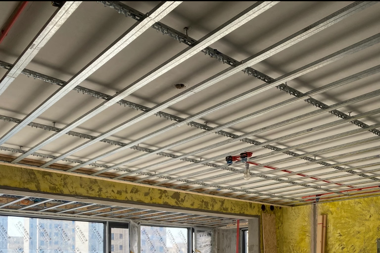 在办公室顶面装修中,轻钢龙骨搭配石膏板是一种经典且实用的选择 。轻钢龙骨通常选用承重力更强的 U 型龙骨,其采用热镀锌钢材制成,具有防锈、防腐蚀的优点,强度高,能够为吊顶提供稳固的支撑结构 。